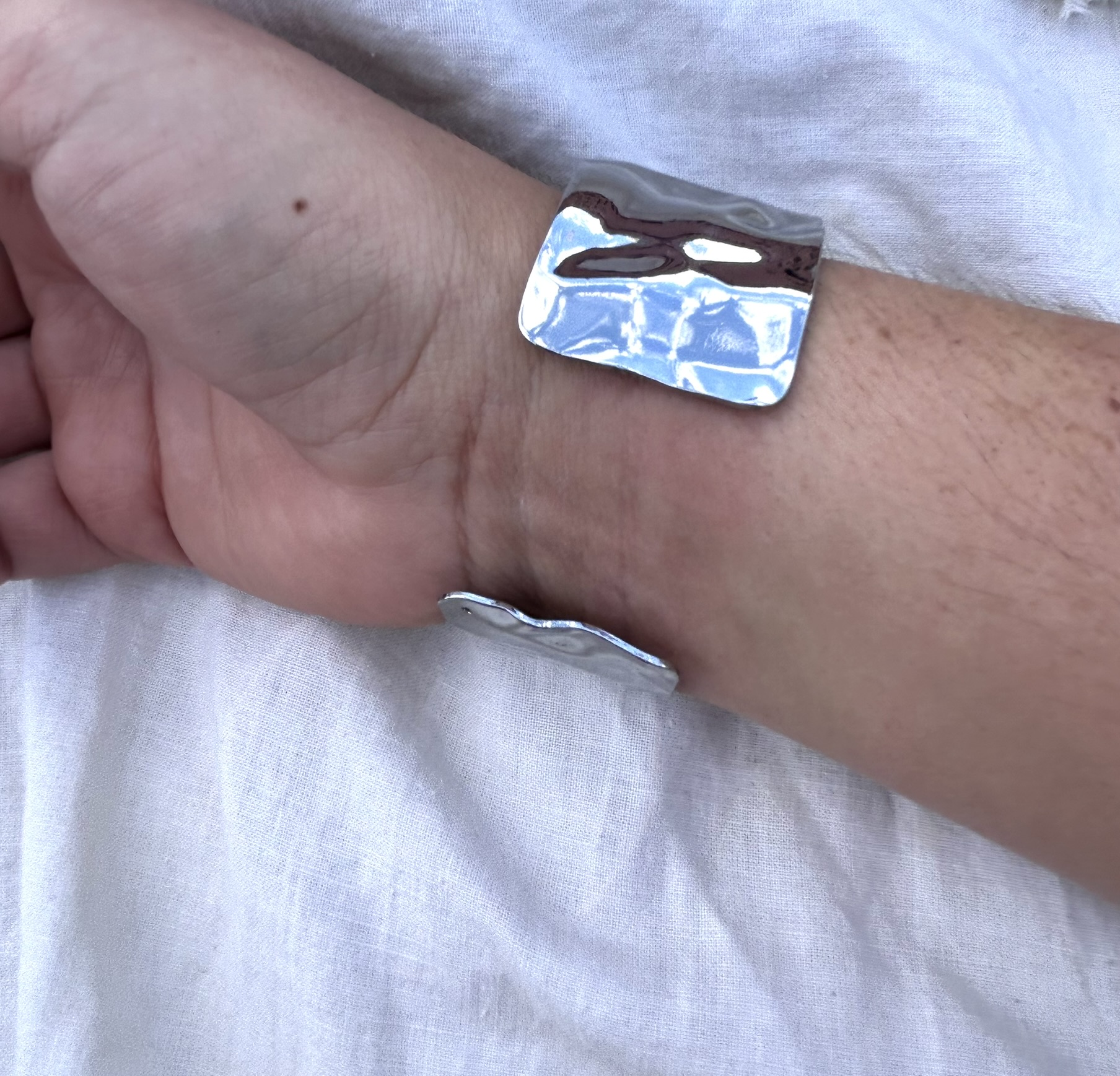 Minimalistisch maar met een opvallende twist: deze silverplated cuff armband heeft een prachtige gehamerde afwerking die het licht op speelse wijze vangt. Het organische, vloeiende oppervlak geeft het sieraad een natuurlijke en toch luxueuze uitstraling.